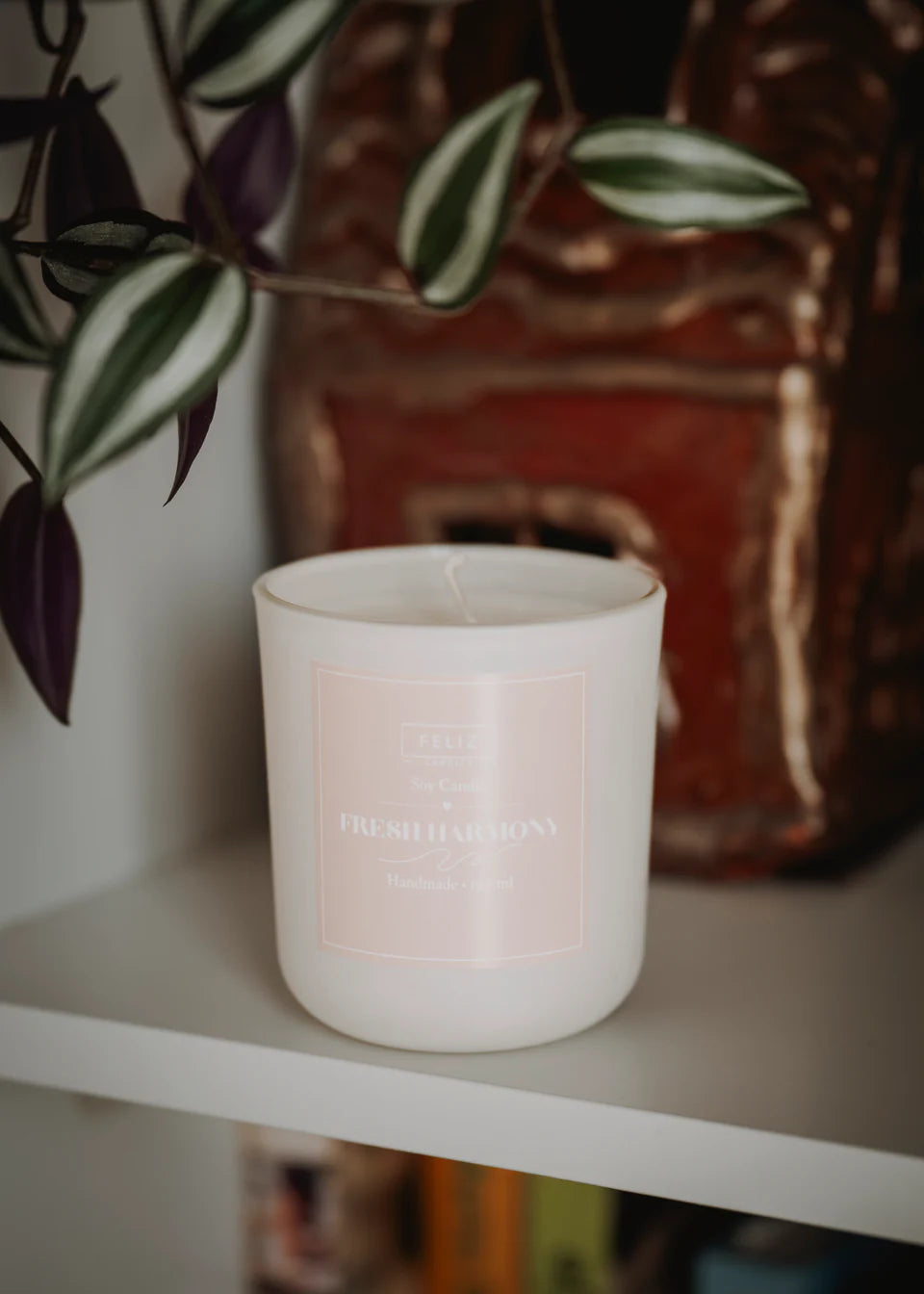 The Fresh Harmony candle is made from eco-friendly soy wax, which ensures an even and long-lasting burn without emitting harmful substances, making it a safe and mindful choice for your well-being.